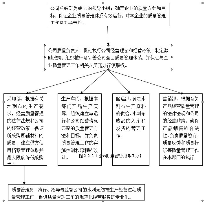 公司的質(zhì)量管理機(jī)構(gòu)是由公司總經(jīng)理直接負(fù)責(zé)質(zhì)量決策、領(lǐng)導(dǎo)和推進(jìn)機(jī)構(gòu),公司具有健全的質(zhì)量保證體系,明確了質(zhì)量職責(zé)和權(quán)限及相關(guān)的激勵(lì)措施等,確保了質(zhì)量戰(zhàn)略的實(shí)施。永信非織造材料有限公司的質(zhì)量管理機(jī)構(gòu)和職能如下圖2.2.2-1。