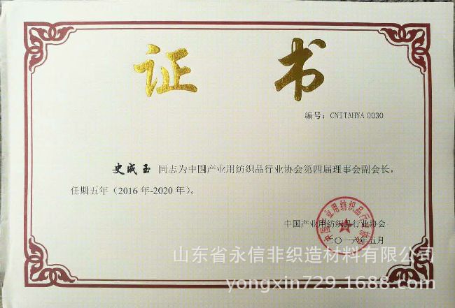 山東省永信非織造材料有限公司董事長總經(jīng)理等領(lǐng)導(dǎo)出席了這次會議,董事長史成玉被評為中國產(chǎn)業(yè)用紡織品行業(yè)領(lǐng)軍人物殊榮,并被推選為中國產(chǎn)業(yè)用紡織品協(xié)會副會長。