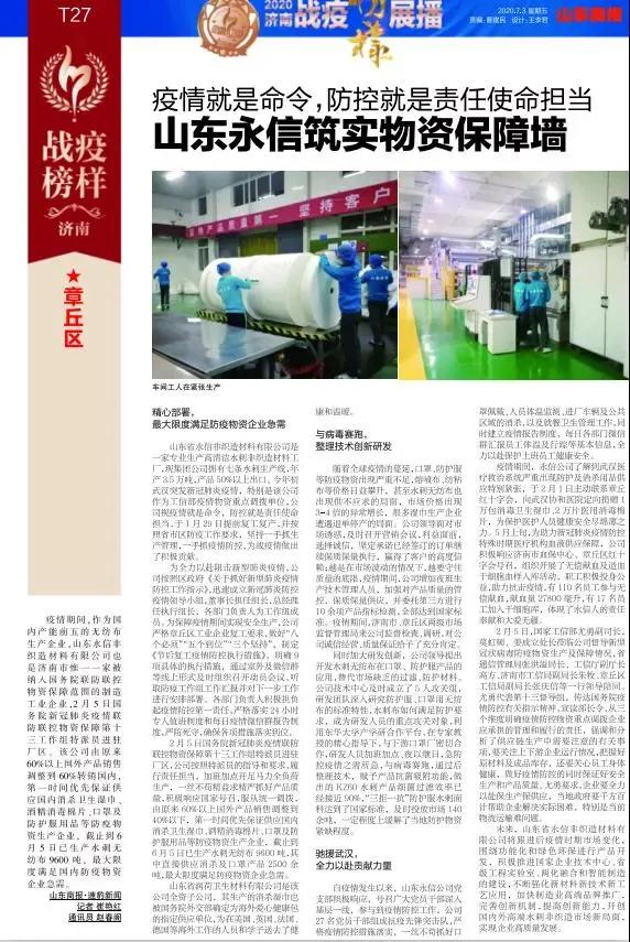 7月3日,由中共濟南市委宣傳部、濟南市精神文明建設委員會辦公室、濟南市衛生健康委員會、《山東商報》社聯合推出的“致敬英雄 點贊榜樣”2020濟南戰疫榜樣頒獎盛典舉行。濟南市委常委、宣傳部部長楊峰,濟南市委宣傳部、濟南市衛健委、魯商傳媒集團有關領導,章丘區委常委、宣傳部部長李寶燕參加活動并為獲獎者頒獎。山東省永信非織造材料有限公司榮獲“戰役團隊”稱號。